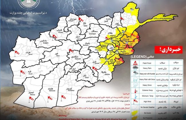 ریاست هواشناسی وزارت ترانسپورت و هوانوردی از احتمال بارش شدید باران و سرازیرشدن آنی سیلاب در ۱۷ ولایت کشور هشدار داده است. این ریاست بارش باران و سرازیرشدن سیلاب را برای فردا (چهارشنبه، ۲۷ سرطان) و پس فردا در ولایتهای بدخشان، تخار، بغلان، پنجشیر، نورستان، کنر، لغمان، کاپیسا، پروان، میدان وردک، کابل، ننگرهار، لوگر، غزنی، پکتیا، خوست و پکتیا پیشبینی کرده است. ریاست هواشناسی همچنین از وزش باد شدید همراه با گردوغبار در ولایتهای شمال، شمال شرق، غرب، جنوب، شرق و مرکز کشور با سرعت بین بین ۵۰ تا ۹۰ کیلومتر در ساعت هشدار داده است.