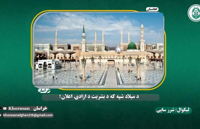 دايې کړکۍ ته نېږدې شوه، اسمان ته يې وکتل، ګومان يې وکړ چې په دغه شپه باندې سپوږمۍ د نورو شپو په پرتله ډېره رڼه ده، ګوندې زړه يې کېږي چې کوټې ته راکوزه شي، ستوري هم ډېر زيات ځليږي، د هاشميانو په کورنو يې نظر واچوه، ارامه ارامي وه، هيڅوک نه دی خبر چې د عبدالله زوی دنيا ته راروان دی. بيا يې مخ کعبې ته واوښت، ګومان يې وکړ چې سپوږمۍ د بخمل تور پوښ وراغوستی چې د سپېنو زرو سيمان په کې تېر شوي دي.