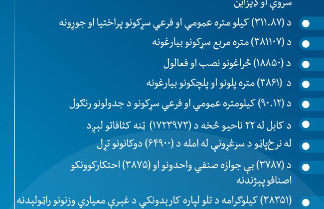 یاد ریاست په بېلابېلو برخو کې د (۳۰۲) کیلو متره سړکونو، (۲۳.۸۵) کیلو متره کانالونو او د موټر د تګ راتګ په موخه د ۴ پلونو د جوړولو لپاره د سروې او ډایزاین چارې ترسره کړي.